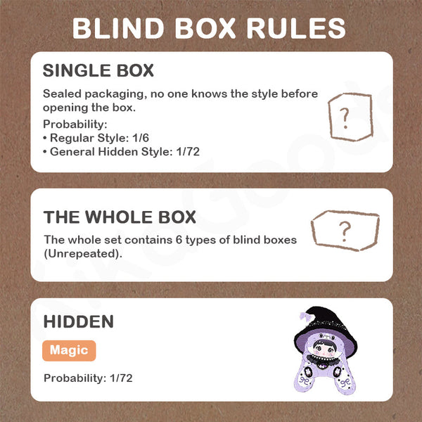 ?What’s Blind Box? “BLIND BOX” is a type of sealed packaging that keeps what’s inside a mystery until you open it. Some are rarer to find, which we call “SECRET” figures. For example, if you order a “Set of 12 Boxes”, you will receive a set of 12 figures in 12 different designs. Note: If there is a “secret” figure in the set you received, one basic figure will be randomly replaced.