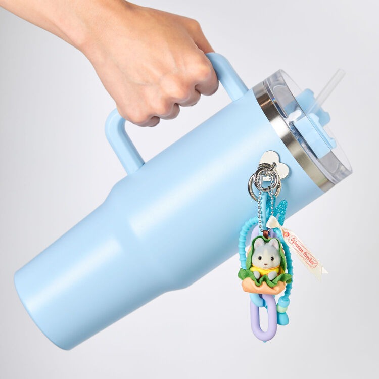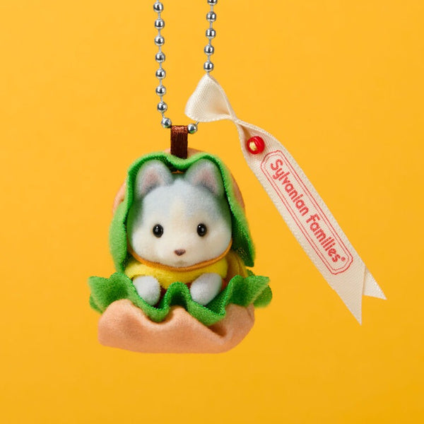 This keychain features Amber, a cute baby husky dressed in a hamburger costume. Take her with you wherever you go. It comes with a Sylvanian Families ribbon tag.